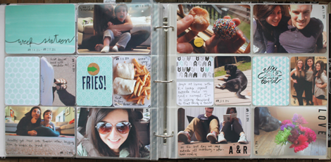 About this spread: I did week in the life documenting this week (spread to come soon), so these pictures really were the best of the best, the cream of the crop considering I took so many over the course of the seven days. I loved all of them, so I kept my journaling cards and date cards pretty simple and all in that seafoam/blue-ish/green-ish color that I love using so much. I used the Amy Tangerine plus one paper pack again because there were a bunch of great papers in that color (date card and first three journaling cards from left to right). It all looks cohesive to me and tells the week's story, even though eventually I'll have a WitL insert between the spread.